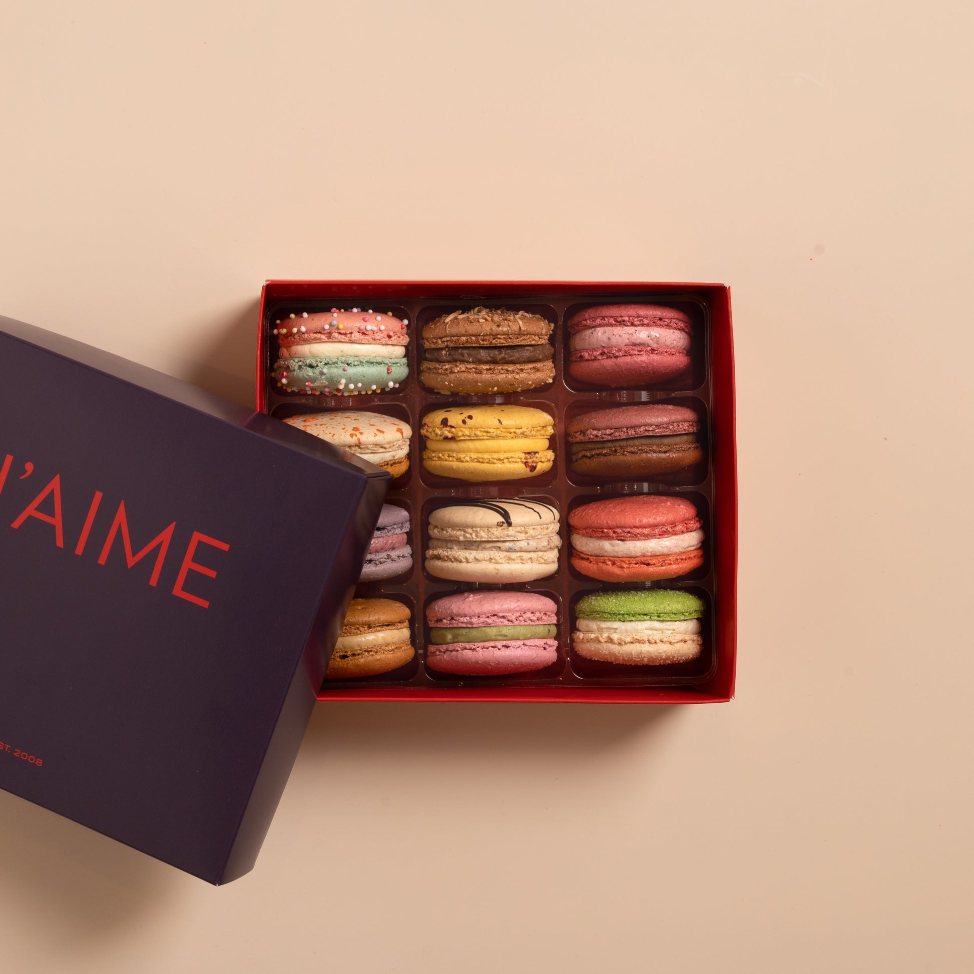 A curated selection of our most loved macarons, featuring a mix of classic, seasonal, and limited-edition flavours. Each one is crafted with the finest ingredients and filled with our signature ganaches and creams, offering a delicious snapshot of what J’AIME does best.
