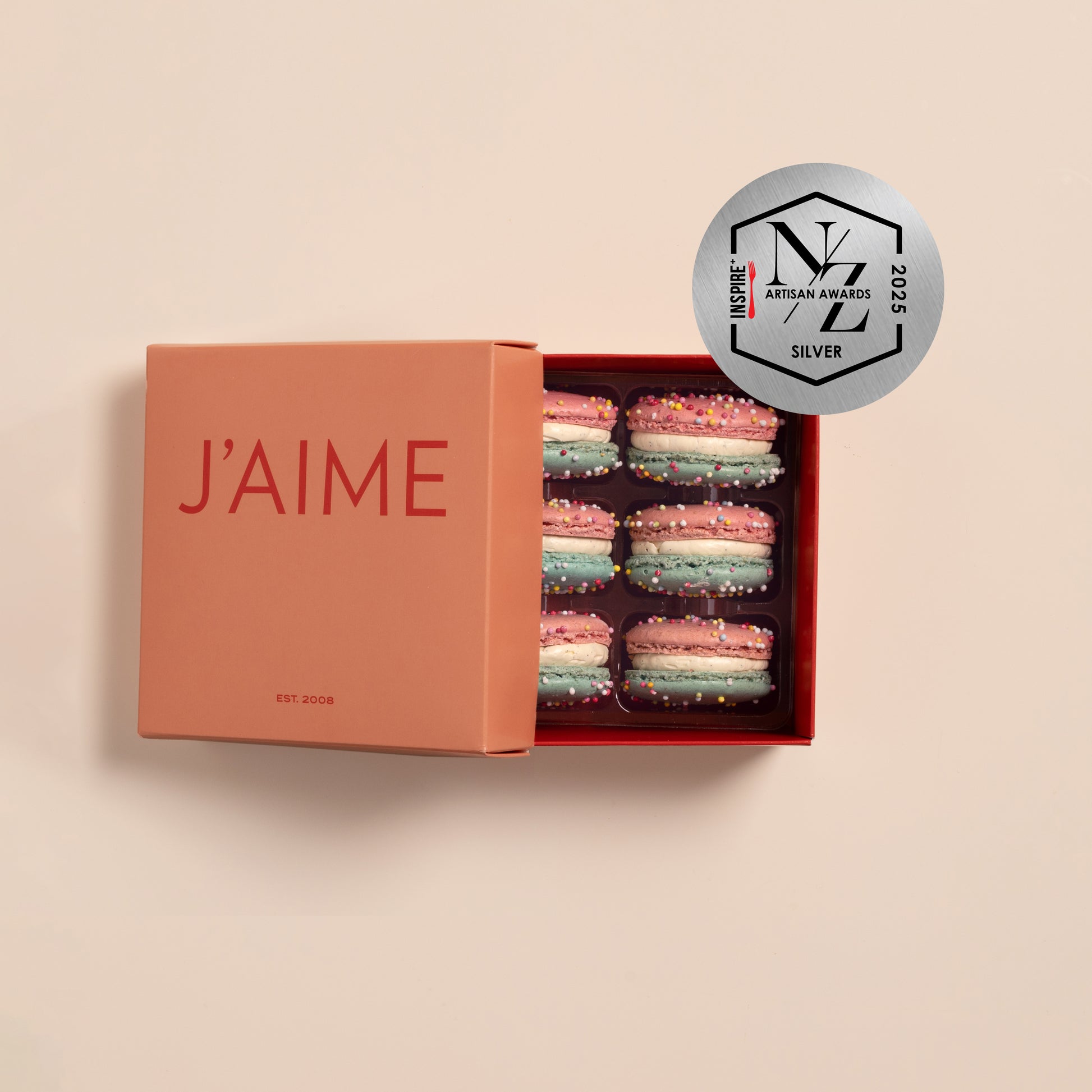 A box of special Birthday Macarons, complete with a candle for the birthday celebrator. Our birthday macarons are filled with a creamy vanilla bean buttercream, with a splodge of strawberry jelly inside - yummo!
